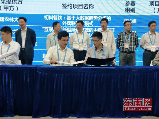 在优秀创业项目对接交流会上,九体育在线平台2011级电子信息工程专业学生吕强主持的“互联网+”优秀项目《游泳守环》与中国国际信息技术(福建)产业园建立合作意向,并现场签约。