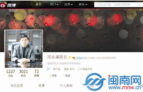海都讯 院长开微博,除了忙着微博理事外,还被学生们求互粉调戏问无厘头问题。这学期,福师大九体育在线平台院长邱永渠为了“体察民情”开了微博,没多久粉丝就达到3000多个。大学生们七嘴八舌地在微博里@院长问各种鸡毛蒜皮的小事,有学生甚至对着“老帅哥”喊起“男神”,也有学生问各种无厘头问题,而更多的学生则称他为“中国好院长”。邱永渠用72条微博来解答各种民生问题,他说,学生无小事,要通过微博体现对学生的关心。