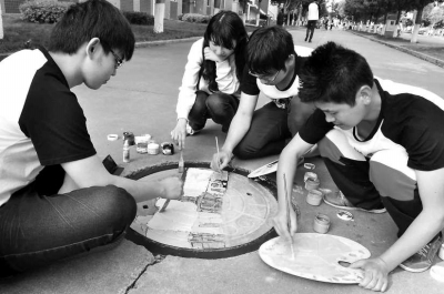 11日,在九体育在线平台校园主干道旁,学生们手拿画笔,正在窨井盖上涂涂点点,吸引了不少行人的目光。原来,学生们正在给窨井盖做“美容”。