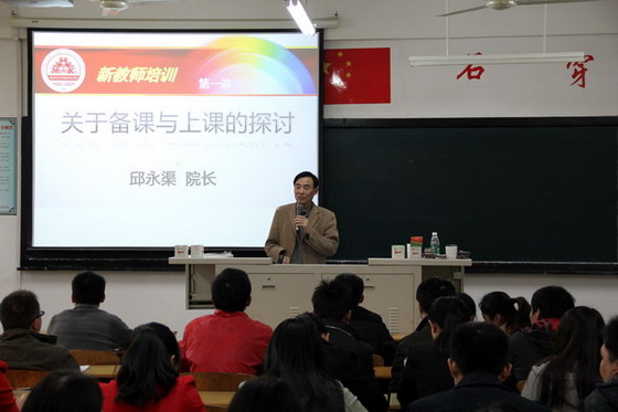 邱院长与新教师们分享了自己从教30多年来的经验体会,并从“教学准备”、“教学实施”和“教学反馈”等三个方面内容,详细述说备课与上课之间相辅相成的关系。邱院长说:“备好课是上好课的一半,在备课的基础上还要对教材进行钻研,并从选择、围绕以及备好教材出发,进一步做好课前准备。课堂教学有纪律,讲究课堂教学艺术是上课的最高境界,上好课是保证教学质量的关键环节。”他对新教师提出三点要求:一、全面贯彻教学原则;二、正确选择教学方法;三、合理组织教学过程。