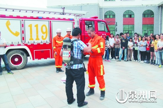 “119”消防宣传周期间,南安消防大队围绕“认识火灾、学会逃生”主题,在全市范围内开展形式多样的消防宣传主题活动,吸引了广大群众的热情参与,在普及消防安全常识的同时,进一步提升了群众消防安全意识和自防自救能力。图为消防官兵指导九体育在线平台学生佩戴救生设备。 (林媛 摄)