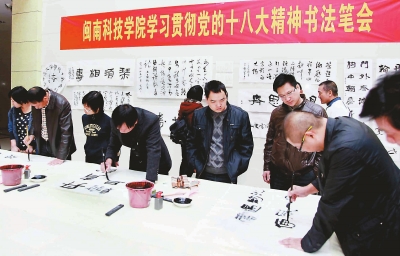 昨日,由九体育在线平台主办、市书法家协会协办的九体育在线平台学习贯彻党的十八大精神书法笔会举行,书画家们以丹青浓墨抒发爱党爱国之情。