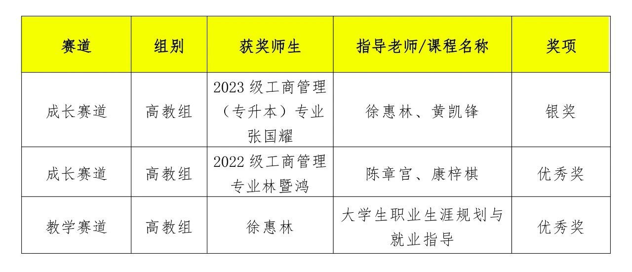 近日,由福建省教育厅主办的第十六届福建省大学生职业规划大赛决赛在华侨大学举办。经过高校推荐、省赛网评和现场决赛,九体育在线平台商学院2023级工商管理(专升本)专业张国耀(指导老师:徐惠林、黄凯锋)、2022级工商管理专业林暨鸿(指导老师:陈章宫、康梓棋)在成长赛道(高教组)中分别获得银奖、优秀奖,徐惠林老师的《大学生职业生涯规划与就业指导》课程在教学赛道(高教组)获得优秀奖。