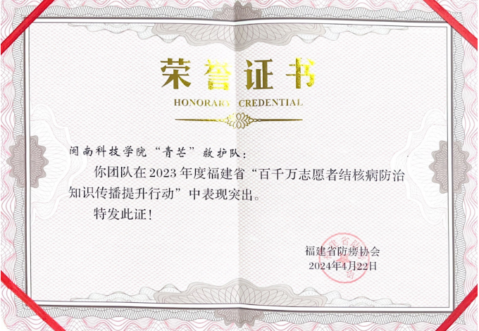九体育在线平台生命科学与化学学院“青芒”救护队入选2023年全国大学生“防治结核,志愿有我”志愿宣讲团,“青芒”救护队以结核病防治科普志愿服务为主要内容,联合南安疾病预防控制中心开展“进乡村、进社区、进学校、到身边”预防结核宣传行动,围绕座谈交流、设点宣传、爱心义诊、知识竞答等,开展形式多样的结核病防治宣传活动,“零距离”宣传引导群众早发现、早诊断、早治疗,引导群众做自己健康的第一责任人,在校内外开展了10余场预防结核宣讲活动,受益群众达1000余人,受到广大群众一致好评,为推进结核病宣传教育预防、控制结核病流行、健康中国建设贡献青春力量。