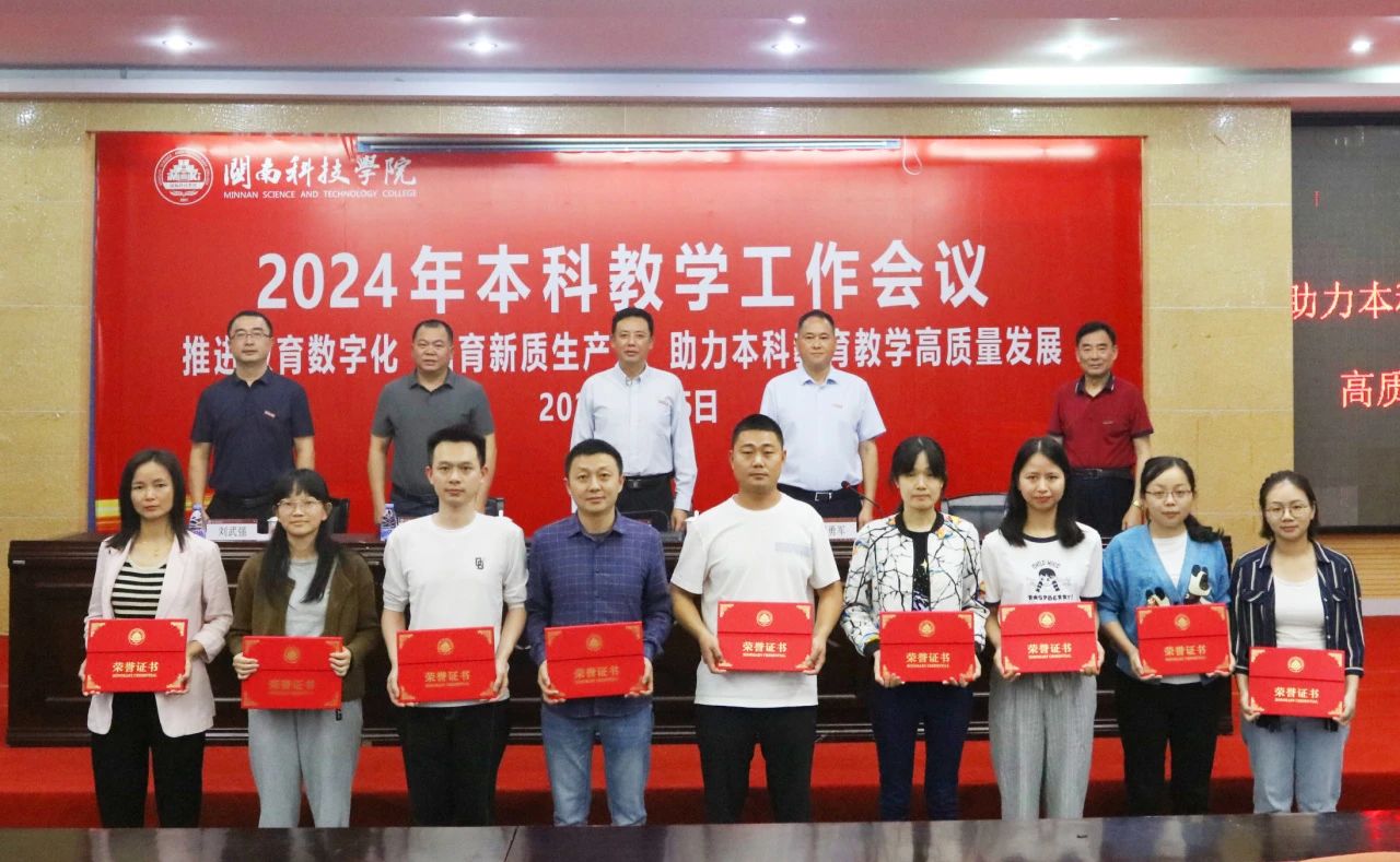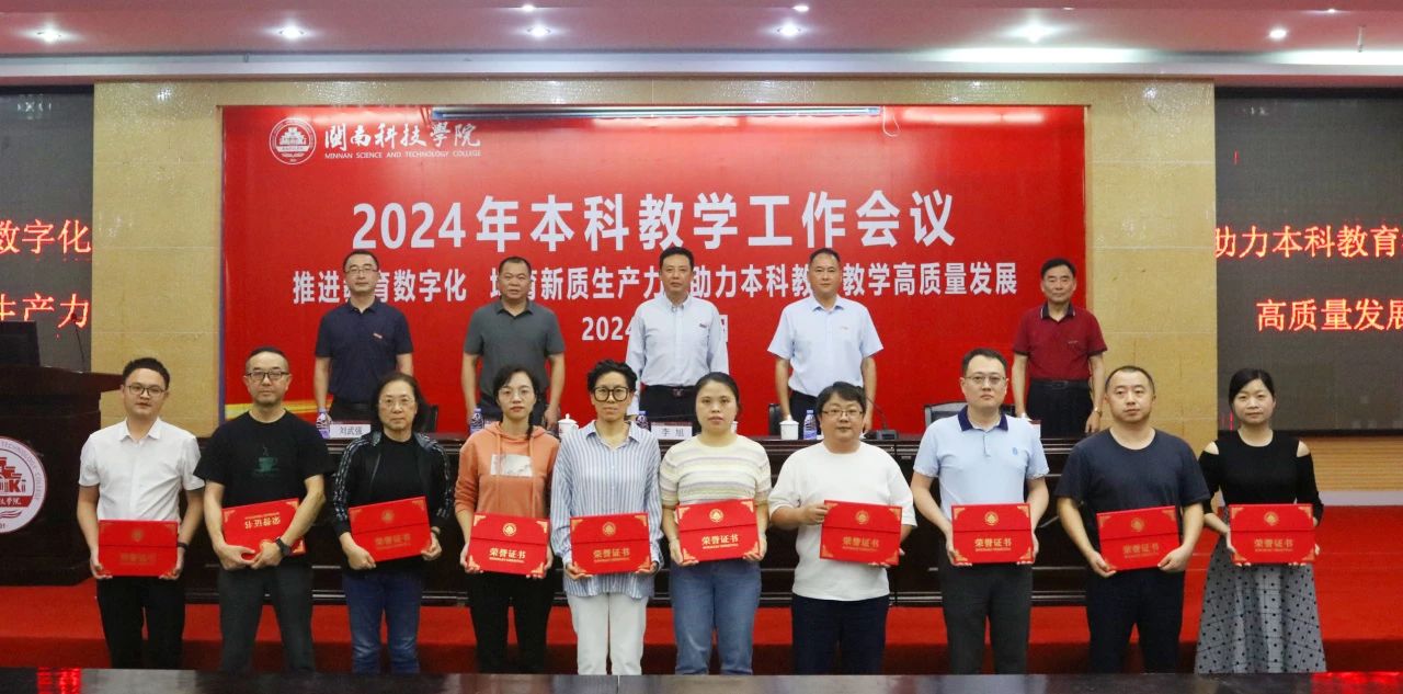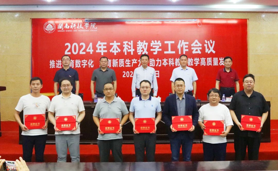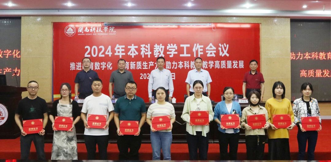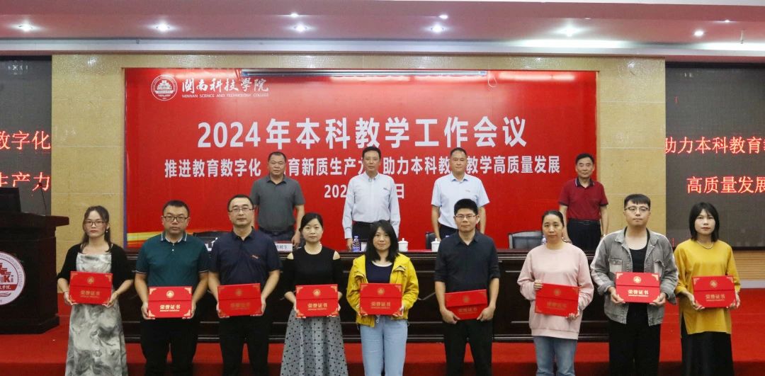 会议表彰了2023-2024学年校级及以上各类教学获奖和立项项目,与会校领导为受表彰教师颁奖。