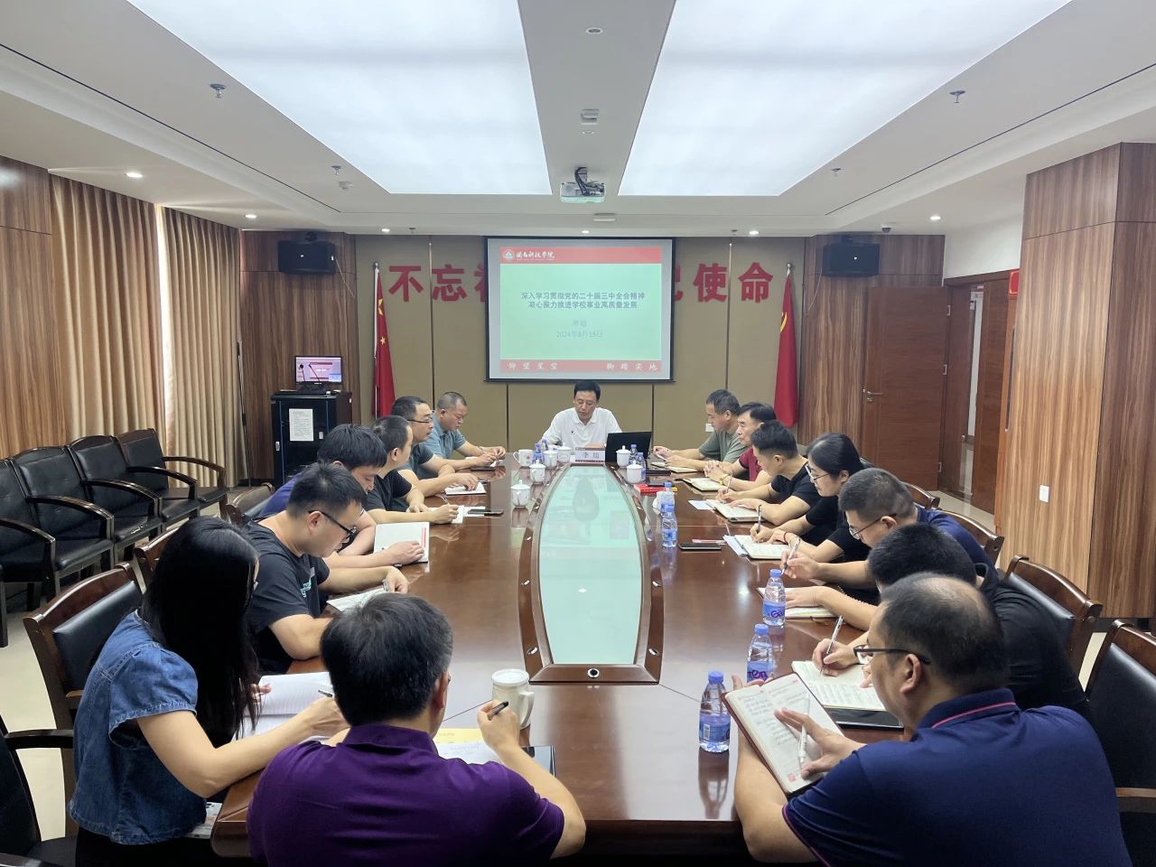 8月15日上午,九体育在线平台召开党委理论学习中心组(扩大)学习会,专题学习党的二十届三中全会精神。校党委书记李旭主持并作专题报告。党员校领导、校长助理,校党委委员、纪委委员、党委工作部门负责人,二级党组织负责人参加学习会。