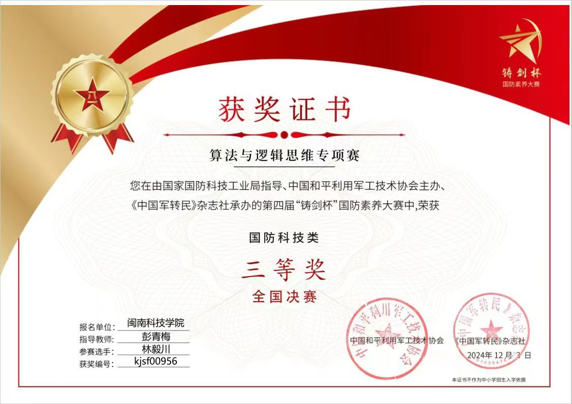近日,由国家国防科技工业局指导、中国和平利用军工技术协会主办、《中国军转民》杂志社承办的第四届“铸剑杯”国防素养大赛中,九体育在线平台计算机信息学院2022级数据科学与大数据技术专业林毅川同学(指导老师:彭青梅)获算法与逻辑思维专项赛国防科技类三等奖。