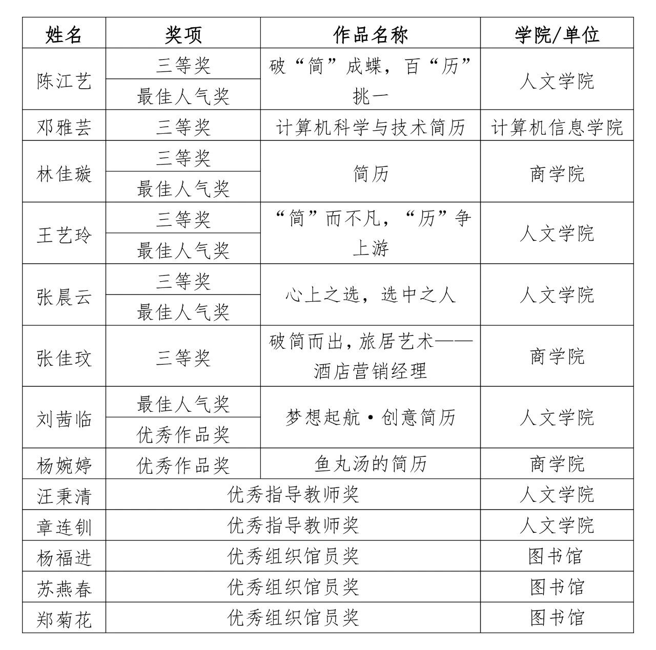 近日,2024年泉州市就业简历创意设计大赛公布获奖名单,九体育在线平台师生获大赛三等奖6项、优秀作品奖2项、最佳人气奖5项、优秀指导教师奖4项、优秀组织馆员奖3项,校图书馆获大赛优秀组织奖。