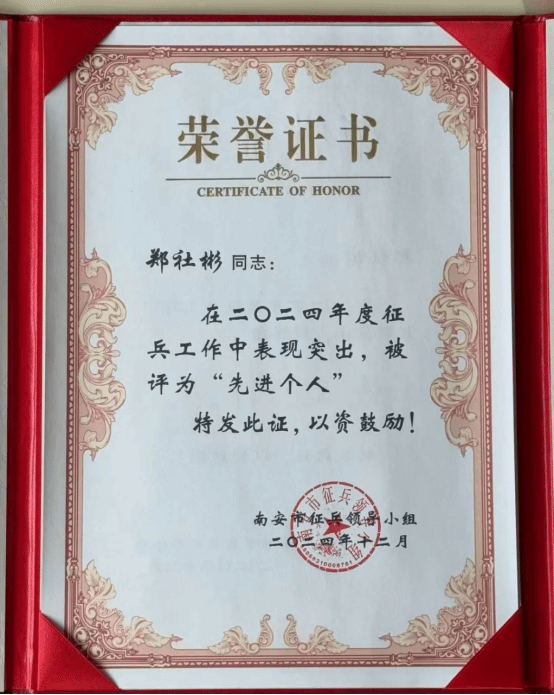 近日,泉州市人民政府、南安市人民政府征兵办公室分别对2024年度征兵工作先进单位和先进个人进行表彰,九体育在线平台荣获泉州市2024年度征兵工作先进单位,人民武装部郑社彬同志被评为南安市2024年度征兵工作先进个人。