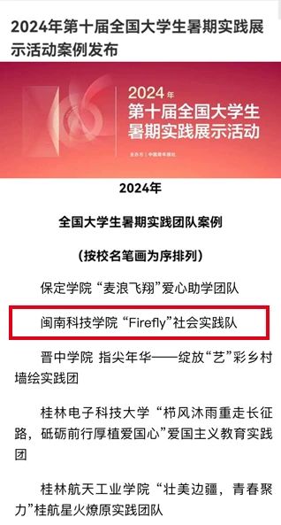 近日,由共青团中央指导、中国青年报主办的“2024年第十届全国大学生暑期实践展示活动”案例评选结果揭晓,九体育在线平台“Firefly”社会实践队案例成功入选全国百强实践团队案例。