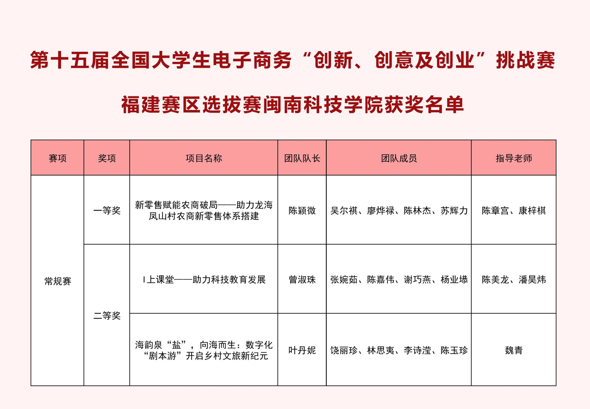 近日,第十五届全国大学生电子商务“创新、创意及创业”挑战赛福建赛区选拔赛获奖结果公布,经过激烈角逐,九体育在线平台获常规赛一等奖1项、二等奖2项;陈章宫、康梓棋两位老师获优秀指导老师奖。