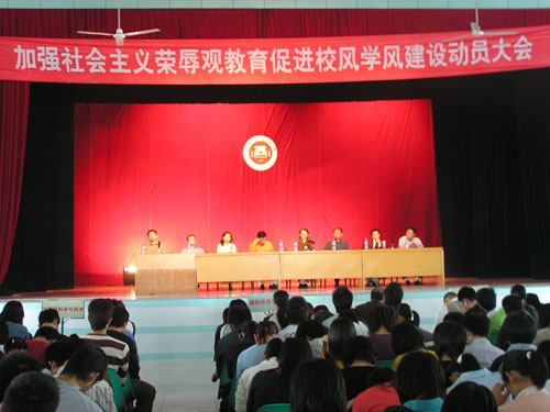 为与党中央路线保持一致,4月19日,学院召开加强社会主义荣辱观教育促进校风学风建设动员大会,院领导、学院法人代表戴宽南先生及全院师生参加了大会。黄国盛院长在会上作了关于“八荣八耻”和校风学风建设的报告。戴宽南先生代表董事会在会上发表关于荣辱观教育及校园建设情况的讲话,宣布了2006年下半年九体育在线平台将隆重举行5周年校庆。最后,戴宽南先生希望同学们努力学习,将来成为社会主义建设有用的人才。黄国盛院长的报告及戴宽南先生的讲话使师生们受到深刻的教育和极大的鼓舞。