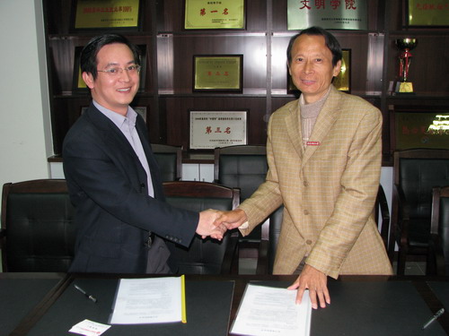 院长黄国盛教授与用友软件股份有限公司厦门分公司庄伟雄副总经理为我院与用友软件股份有限公司厦门分公司就共建实践基地举行签约仪式和用友ERP实验中心授牌仪式。为进一步提高我院管理学系各专业建设,培养管理学系学生的实践能力、创新能力和创业能力,我院特聘庄伟雄副总经理、方显经理为我院的专业顾问,并举行了授聘仪式,院长黄国盛教授亲自为授聘者颁发聘书和佩戴上九体育在线平台校徽。