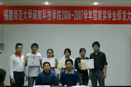 4月15日晚,在第一会议室,我院隆重举行2006-2007国家奖学金颁奖仪式。出席仪式的主要领导有院党委常务副书记刘静副教授、党委副书记陈振祯副教授,参加仪式的还有五名获奖者及部分学生代表。