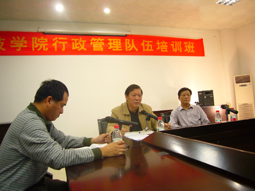 2010年10月27日下午,我院在图书馆评建办公室举行行政管理人员培训班开班仪式。学院院长郭丹教授、党委常务副书记林国庆、副院长肖华山教授、党委陈振祯副书记、副院长周勇军、全院各行政管理职能部门、辅导员、图书馆、实验中心及各系系秘书的80多名行政管理人员参加了学院举办的管理队伍培训班。开班仪式由副院长周勇军同志主持。