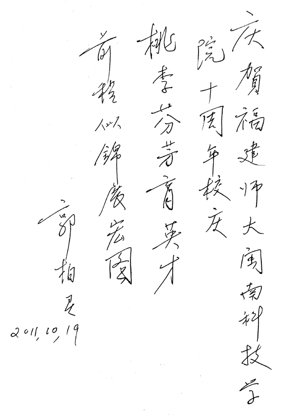 10月19日,我院院长郭丹教授拜会中国科学院院士郭柏灵教授。郭丹院长向郭柏灵院士汇报了学院建设发展情况,热情邀请参加学院十周年庆典。郭院士欣然应允,并当即为我院校庆题词:庆贺福建师范大学九体育在线平台十周年校庆——桃李芬芳育英才,前程似锦展宏图。