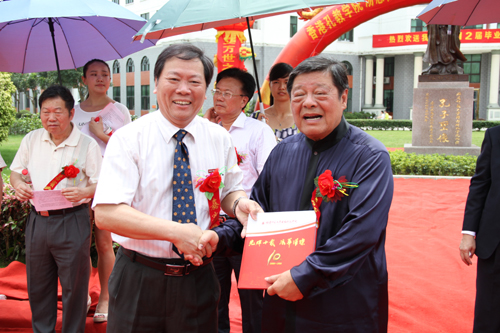 6月26日上午,我院在校大门口举行孔子圣像揭幕仪式。圣像捐赠人、香港孔教学院院长、国际儒学联合会副理事长汤恩佳博士,香港孔教学院副院长、香港汤恩佳孔子思想宣讲团永久荣誉团长、香港孔教总会永远名誉会长吕天增先生,香港汤恩佳孔子思想宣讲团团长、复旦大学博士杨发坤先生,南安市副市长李清安先生,福建师范大学校长助理郭警修先生,泉州市文庙管理处何振良先生,福州市孔子学会常务副会长柯远扬教授,福州市孔子学会秘书长、孔子75代孙孔海钦先生,我院戴宏达董事长、戴宽南副董事长、郭丹院长、林明旭党委常务副书记和有关部门负责同志、师生代表,福州市孔子学会理事、部分会员以及社会各界人士参加了揭幕仪式。仪式由我院周勇军副院长主持。
