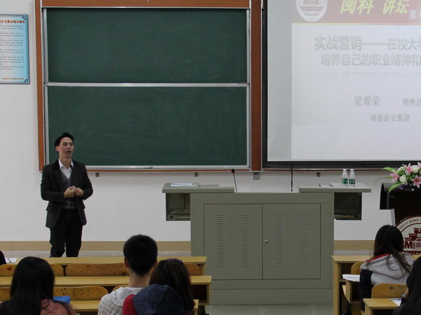 11月20日下午,“九体育(中国)”邀请福建奋安集团销售总经理梁观荣在菲华教学楼C#102作了题为“实战营销--在校大学生应如何培养自己的职业精神和营销素质”的讲座。讲座由经济管理系主任陈晓川主持。