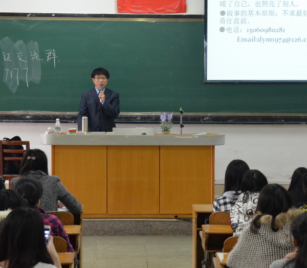 讲座现场气氛热烈,吸引众多同学前来听取。邓博士一一耐心解答同学们提出的问题,使同学们进一步了解了2015年国考教师资格证改革政策和考试大纲。