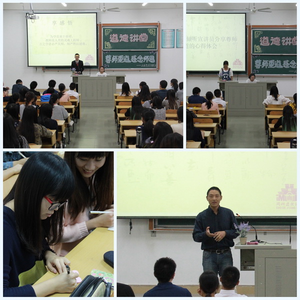 活动在全体师生朗诵《师说》重温经典环节中拉开帷幕。在“温典故”环节,通过观看《程门立雪》视频,学习杨时尊师重道的经典故事;在“看短片”环节中播放了我院“我最喜爱的好老师——罗江华”先进事迹,并邀请罗江华老师现场分享了尊师重道的故事,一个个感人至深的事例,与现场师生产生共鸣,博得阵阵掌声;在“享感悟”环节,来自该系不同专业的同学用朴实的话语表达了自己发自内心的“尊师重道感念师恩”。讲堂现场气氛热烈,活动中还同步进行了微博互动大讨论。
