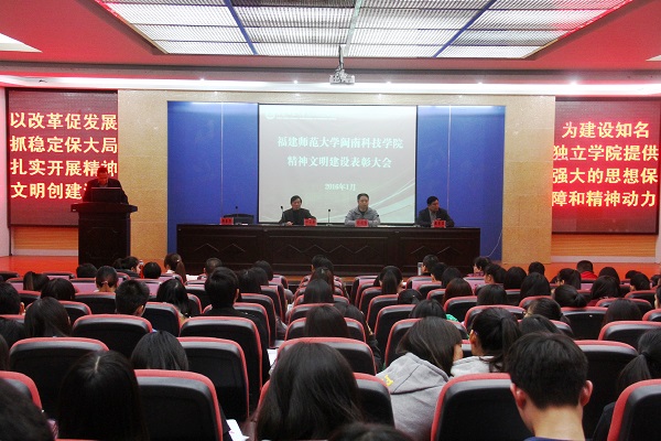 随后,周勇军副院长宣读了2014—2015年度精神文明建设先进集体和先进个人表彰名单。主席台领导为获奖单位代表和个人颁奖。会议表彰了学院办公室等5个单位“2014-2015年度精神文明建设先进集体”称号,孙文缘、陈秋萍等8名师生“2014-2015年度精神文明建设先进个人”荣誉称号,林佳喜、潘昊炜等3个家庭“2014-2015年度精神文明建设文明家庭”称号,康美校区兰苑6#611、美林校区菊苑A#401等16间宿舍“2014-2015年度精神文明建设文明示范宿舍”称号。