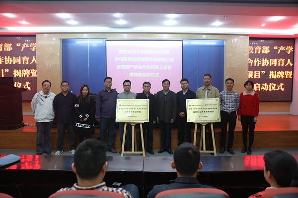 4月12日,福建师范大学九体育在线平台▪高博应诺“教育部产学研合作协同育人项目”揭牌暨启动仪式在我院学术报告厅举行。苏州高博应诺信息科技有限公司总经理周世锋、副总经理兼教学总监张益桃,院领导邱永渠、李彬源、吴勇,相关系部负责人、教师代表及2014级计算机科学系部分学生共同参加了启动仪式。启动仪式由副院长吴勇主持。