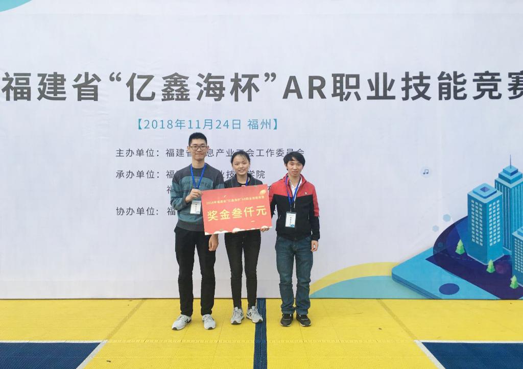 11月24日,2018年福建省“亿鑫海杯”AR职业技能竞赛于福建信息职业技术学院圆满落幕,我院计算机与信息学院大学生软件人才培训基地代表队(成员:刘兵、刘鑫宇、黄梓棋,指导老师:禹谢华)获得团体二等奖。