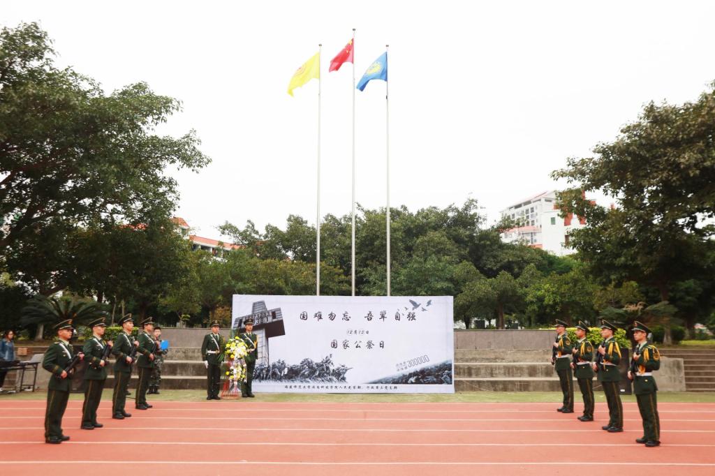 全场师生通过齐唱国歌、集体默哀、敬献花圈、集体宣誓等方式悼念惨遭日军杀戮的死难者同胞,重温悲痛记载的历史。上午10:01,防空警报响起,全场师生集体默哀一分钟,这一分钟我们用来缅怀先辈,这一分钟我们用来铭记历史。