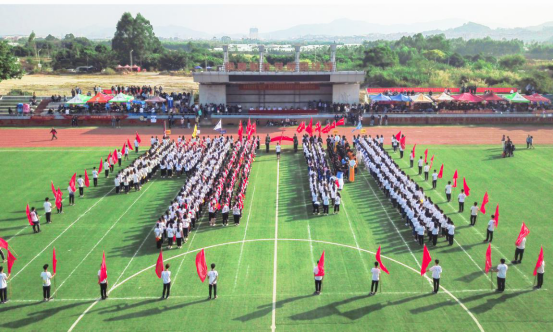 伴随着庄严雄伟的《运动员进行曲》,仪仗队庄重地托举着国旗、校旗,花束队、彩旗队为先导,7个二级学院方阵迈着整齐的步伐依次入场。
