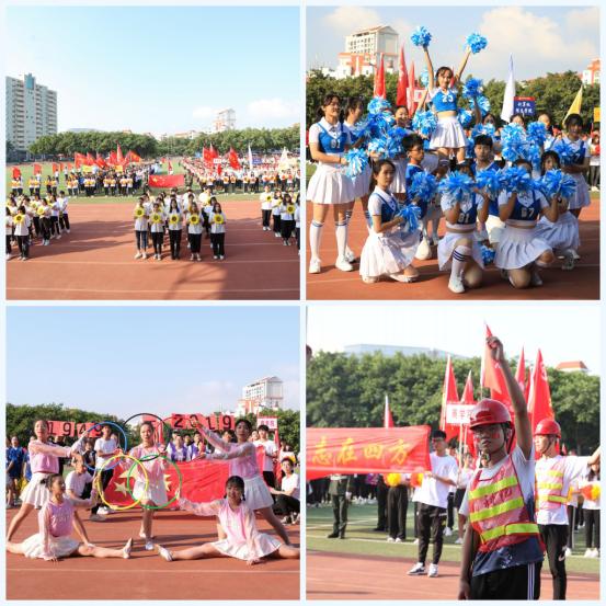 在入场式中,各二级学院表演队伍,合着激情飞扬的节拍热情放歌、变幻舞姿、组合图案,运用彩旗、彩扇、卡纸、运动器材、工程器械等道具,融入歌舞、朗诵、啦啦操、运动表演等多种形式,创意独特、精彩纷呈的表演博得现场阵阵掌声。其中,商学院代表队推出5支展示专业名称的帆船,在波动的红扇中扬帆起航,乘风破浪;生命科学与化学学院代表队模拟表演运动竞技,一曲《北京欢迎你》惊艳全场;计算机信息学院代表队借用电脑元素展示专业特色,并演绎不同类型舞蹈;光电信息学院代表队身着民国服饰,齐声朗诵爱国诗歌《岳飞》,搭配活力现代舞,展现新时代、新生活、新面貌;土木工程学院代表队的专业测绘仪器、安全头盔和工作服饰,尽显专业风采;人文学院代表队的活力啦啦操,洋溢着青春与活力;艺术设计学院代表队以向日葵为道具,摆出“70”字样,礼赞新中国成立七十周年;最后,教职工代表队挥舞红旗,气宇轩昂走进运动场。