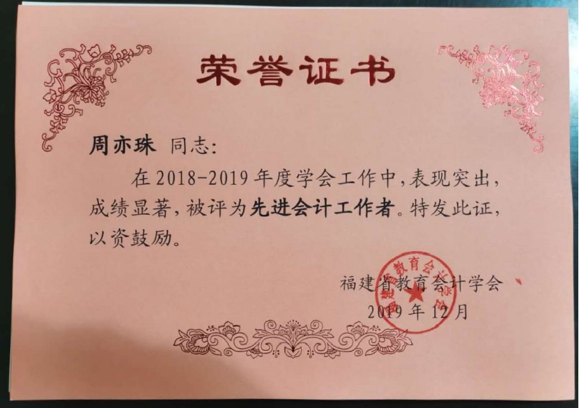 近日,福建省教育会计学会对全省高校财务工作先进单位与个人进行表彰,九体育在线平台财务处获评“2018-2019年度学会工作先进财会单位”。财务处处长周亦珠被授予“先进会计工作者”荣誉称号。