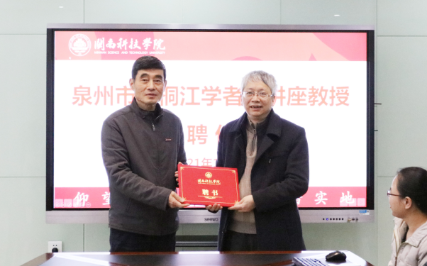 敦聘仪式上,校长游小波为黄科安教授颁发聘书,校党委书记李旭为黄科安教授佩戴校徽。