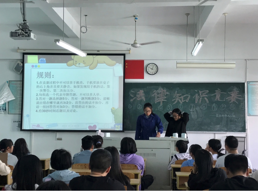“宪法自1982年公布施行以后,一共通过了几次修正案?”“根据《宪法修正案》规定,国家对非公有制经济实行什么政策?”……在马克思主义学院黄鑫英老师的“思想道德修养与法律基础”课堂上,同学们抢答声、喝彩声、鼓掌声阵阵响起,与平日里安静的课堂氛围形成了鲜明对比。这是马克思主义学院推动法律知识进课堂的生动一幕。
