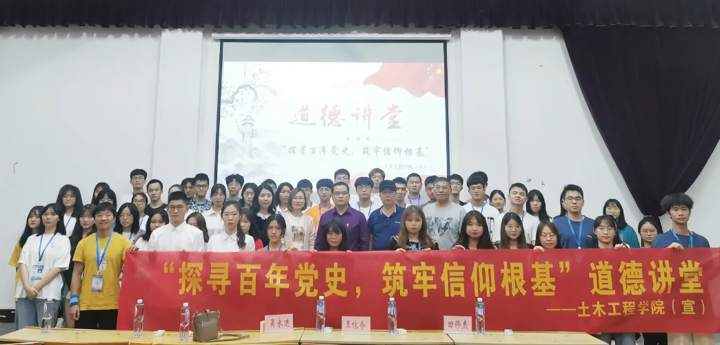 “秋收起义红安源,南昌城头燃烈焰。工农先锋聚井冈,武装割据换新天。人民翻身党领航,镰刀斧头成中坚……”4月20日,土木工程学院组织开展 “探寻百年党史,筑牢信仰根基”道德讲堂活动。活动结合诗朗诵、观看纪录片、主题党课、党史知识竞答等形式,以“道德讲堂”为载体,150名师生们在活动中汲取奋进力量,增强使命担当。
