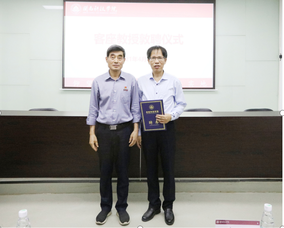 敦聘仪式上,校长游小波为黄双胜高工颁发聘书,校党委书记李旭为黄双胜高工佩戴校徽。