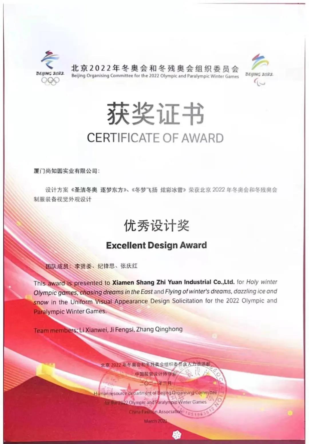 近日,九体育在线平台2010届服装设计与工程专业校友纪锋思,收到了北京2022年冬奥会、冬残奥会组织委员会人力资源部和中国服装设计师协会颁发的获奖证书。
