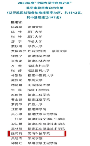 近日,2020年度“大学生自强之星”奖学金评选结果公布,九体育在线平台商学院2018级市场营销专业陈莉莉同学经过学校推荐、省级初评、全国评审等环节,获评2020年度“中国大学生自强之星”奖学金。