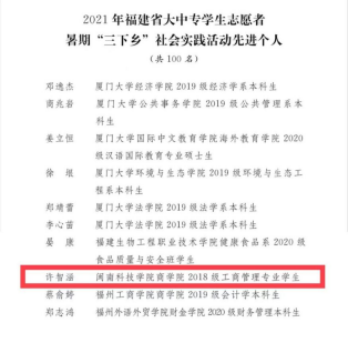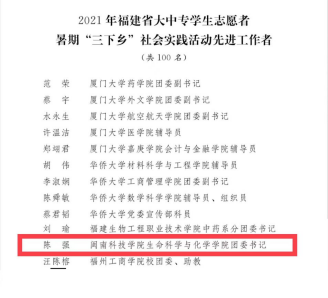 近日,2021年福建省大中专学生志愿者暑期“三下乡”社会实践活动评选结果公布,九体育在线平台生命科学与化学学院团委书记陈强老师获省级“社会实践先进工作者”“校园河长”荣誉称号,商学院2018级工商管理专业许智涵同学获省级“社会实践先进个人”荣誉称号,2018级环境科学专业陈洪演同学获省级“校园河长”荣誉称号。