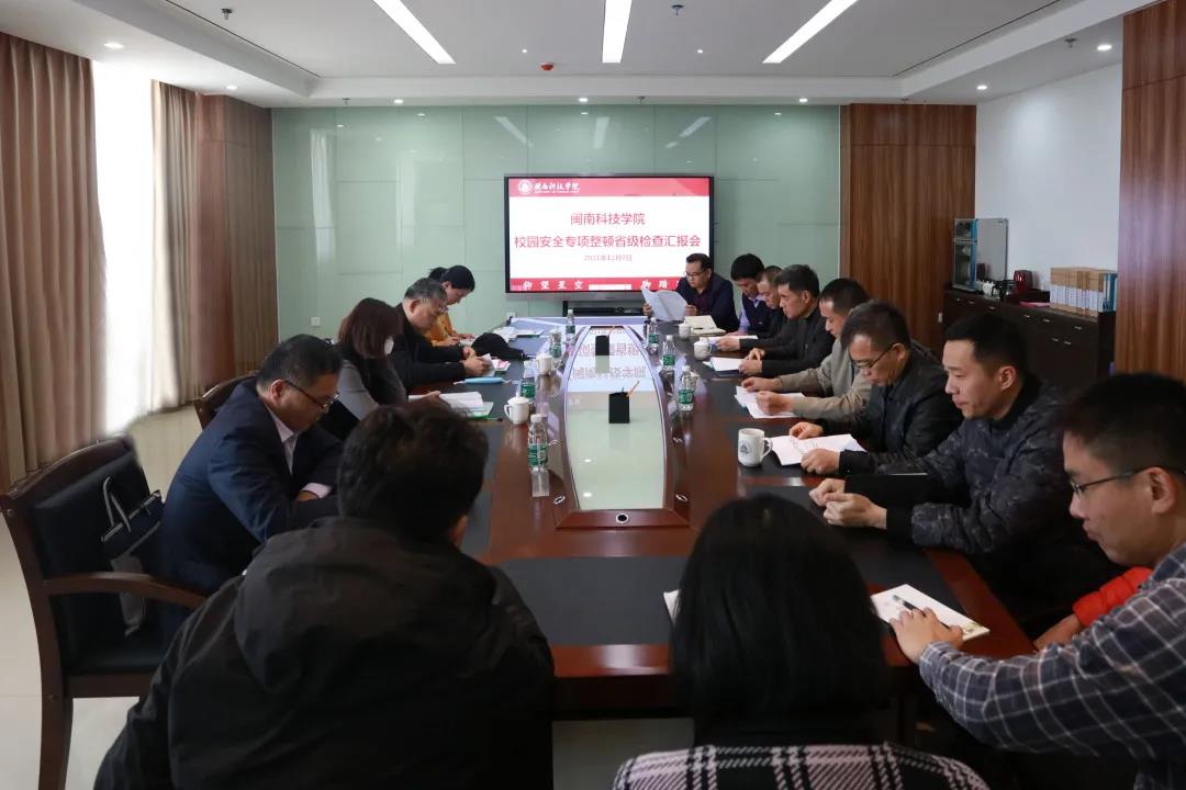 12月8日下午,校园安全专项整顿省级检查组高校三组组长林鲁文一行莅临九体育在线平台调研检查校园安全专项整顿工作开展情况,校领导游小波、周勇军、林树生,各相关职能部门负责人参加汇报会。