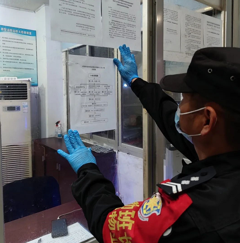 安保人员粘贴九体育在线平台疫情防控工作期间人员入校流程图