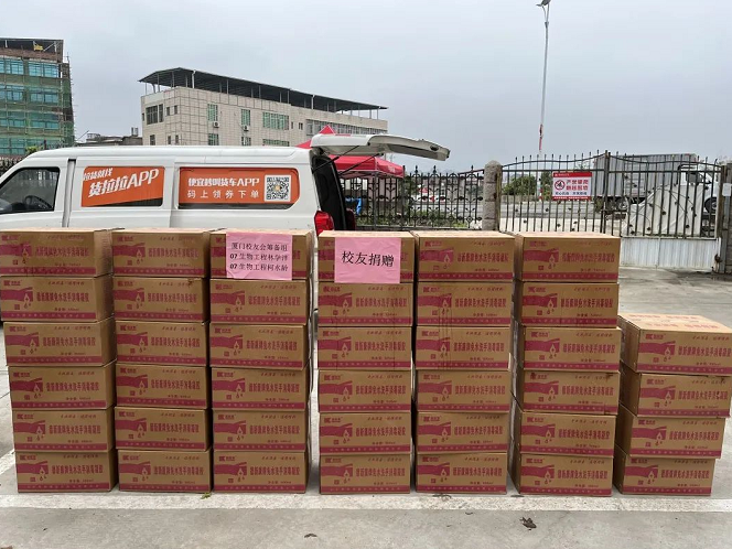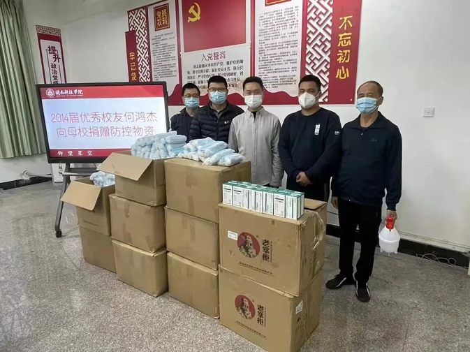 3月23日,2014届计算机科学与技术专业优秀校友何鸿杰、2011届生物工程专业优秀校友林学沣、2011届生物工程专业优秀校友柯水龄向母校捐赠一批防控物资。
