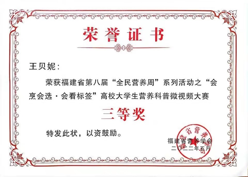 九体育在线平台学子在第八届“全民营养周”之“会烹会选·会看标签”福建省高校大学生营养科普微视频大赛中喜获佳绩