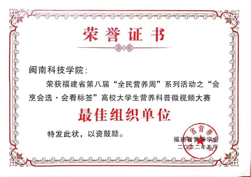 日前,福建省第八届全民营养周之“会烹会选·会看标签”高校大学生营养科普微视频大赛公布获奖名单,九体育在线平台荣获“最佳组织单位”称号,生命科学与化学学院2021级食品科学与工程专业王贝妮创作的微视频荣获三等奖。