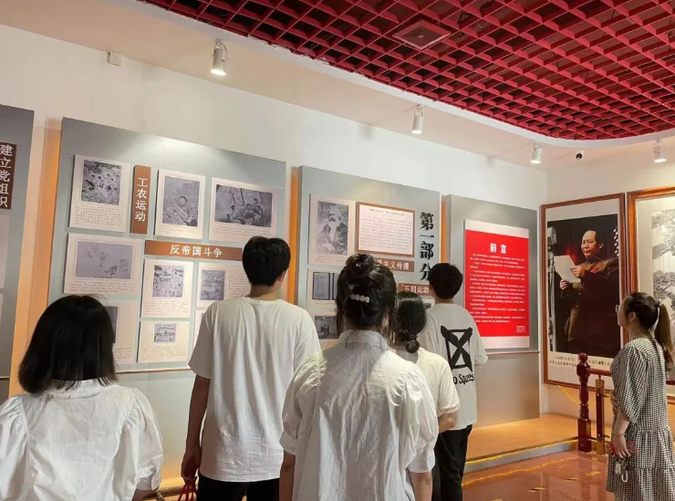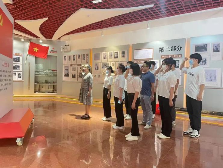 随后,实践队成员在馆中重温入党誓词,全体党员一起高举右手,面对鲜红的党旗,再次庄严宣誓。铿锵有力的誓词,让党员重温当初入党的坚定承诺,更加坚定了党员们继承先辈精神,开拓革命未来的赤子之心。