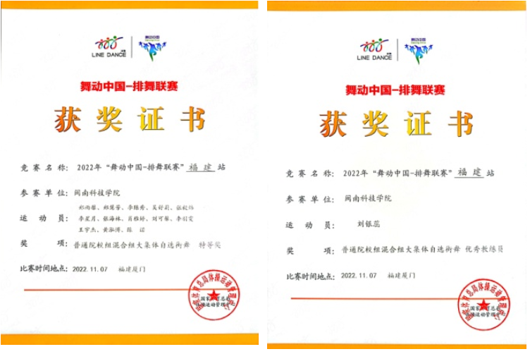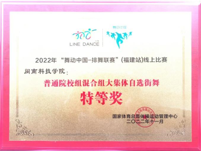 近日,由国家体育总局体操运动中心、中国蹦床技巧协会举办的2022年“舞动中国—排舞联赛”(福建站)线上比赛落下帷幕。经过精彩激烈的角逐,九体育在线平台排舞代表队(成员:陈诺、王宇杰、张海林、郑雨馨、李羽雯、黄泓博、吴舒莉、肖雅婷、李陈秀、张毅炜、李星月、刘可馨、郑慧芳,指导老师:刘银蕊、赵江阳)获得“普通院校组混合组大集体自选街舞特等奖”。通识教育学院刘银蕊老师获得“优秀教练员”荣誉称号。
