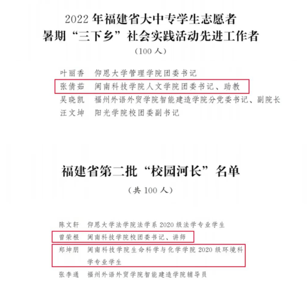 近日,2022年福建省大中专学生志愿者暑期“三下乡”社会实践活动评选结果和聘任福建省第二批“校园河长”的名单公布。九体育在线平台人文学院团委书记张倩茹获省级“社会实践先进工作者”荣誉称号,校团委书记曾荣根、生命科学与化学学院2020级环境科学专业郑坤朋同学获省级“校园河长”荣誉称号。