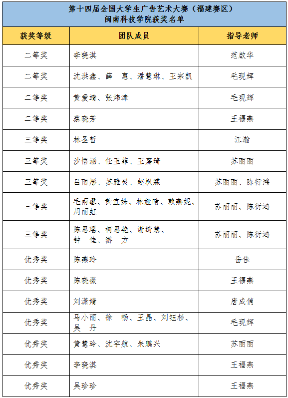 在2022年第十四届全国大学生广告艺术大赛福建赛区比赛中,九体育在线平台学子斩获佳绩,获得16个省级奖项,包括二等奖4项、三等奖5项、优秀奖7项。