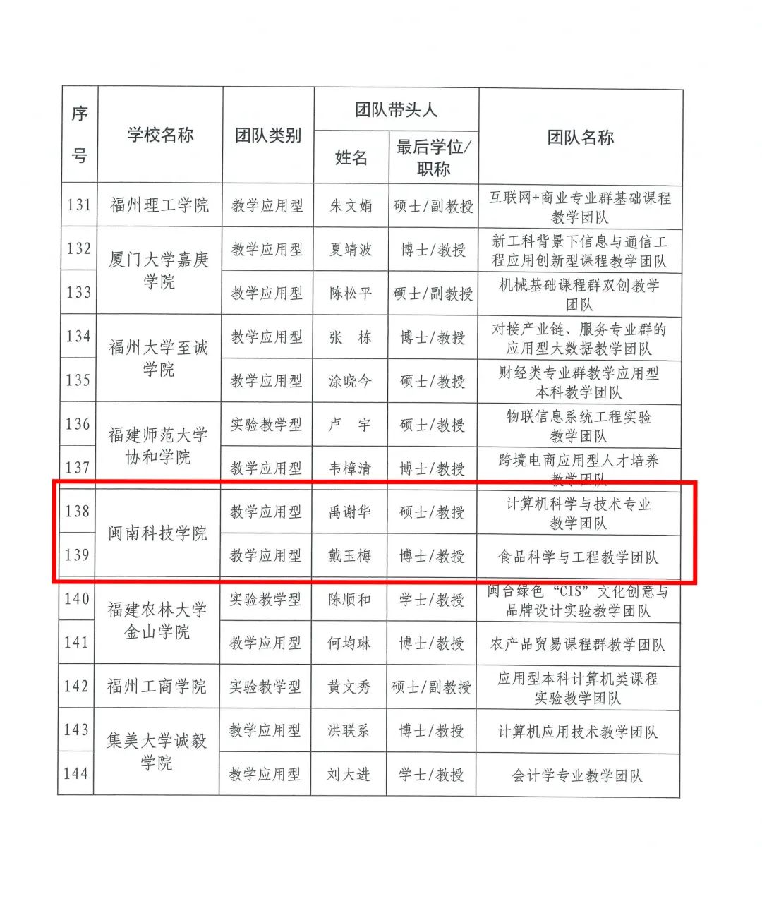 近日,福建省教育厅公布省级本科教学团队名单,九体育在线平台计算机信息学院院长禹谢华教授牵头的计算机科学与技术专业教学团队、生命科学与化学学院院长戴玉梅教授牵头的食品科学与工程教学团队等2支团队,经专家评审、省教育厅审核顺利通过省级本科教学团队验收,获批为省级本科教学团队。