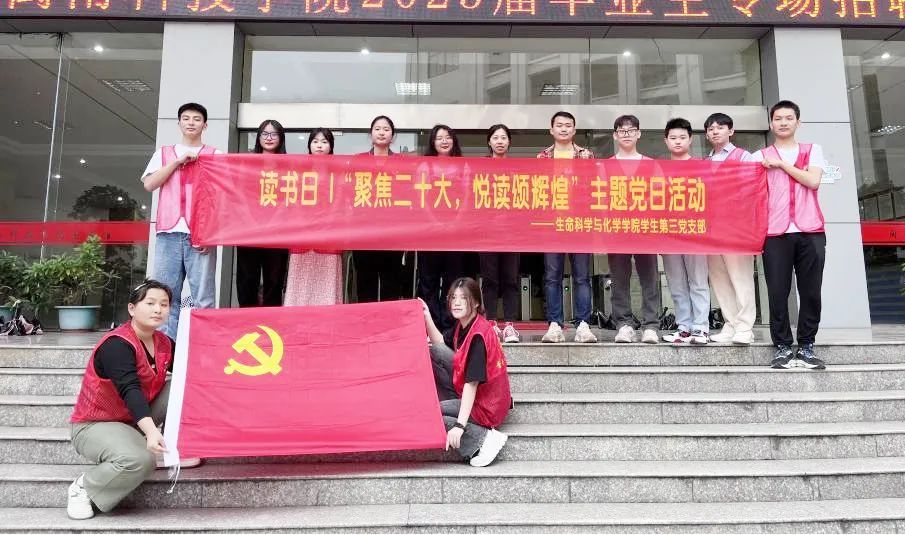 4月20日、21日,生命科学与化学学院学生第三党支部开展“聚焦二十大,悦读颂辉煌”主题党日活动。活动围绕读书分享、书签绘制、志愿服务等内容展开,多形式激发学生党员的读书兴趣,引导学生党员从阅读红色经典中汲取奋斗力量,厚植爱党爱国爱社会主义情感。