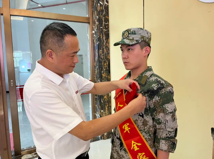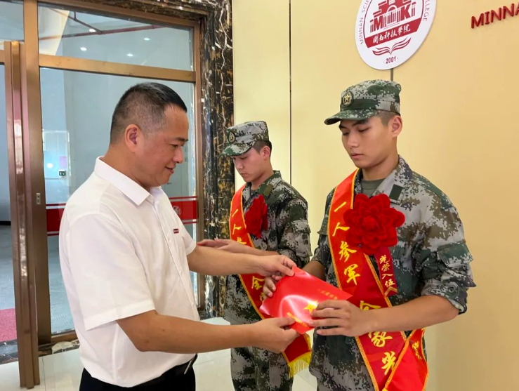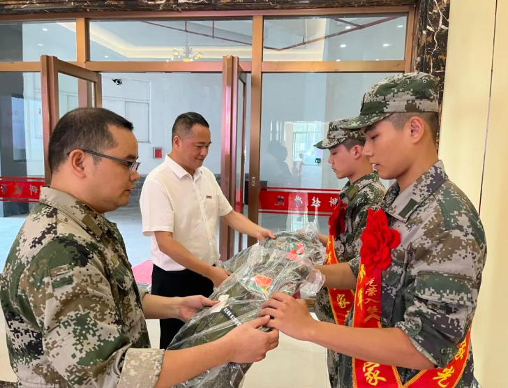 欢送现场,周勇军分别为参军入伍的计算机信息学院2021级计算机科学与技术(专升本)专业黄松杰、生命科学与化学学院2022级环境科学专业董贵琳佩戴红花、发放入伍通知书和赠送入伍纪念品。